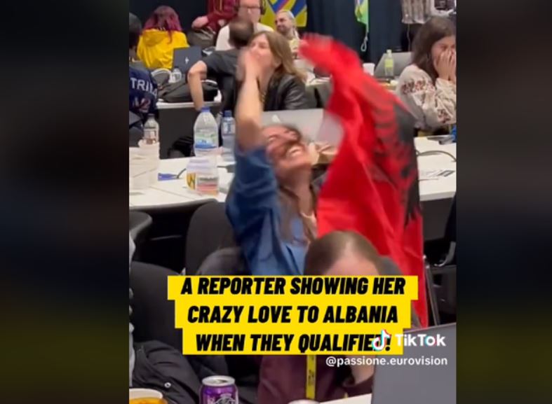 Një detaj që bie në sy, është flamuri kombëtar shqiptar që reporterja mban në duar teksa bërtet nga gëzimi për fitoren e madhe të Shqipërisë në këtë kompeticion të rëndësishëm Evropian të muzikës. Veprimi i reporteres ka tërhequr vëmendjen e gjithë të pranishmëve në prapaskenë.