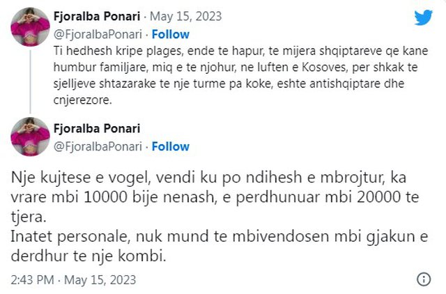 Ponari ka postuar dy statuse në Twitter duke kujtuar gjenocidin serb në Kosovë.