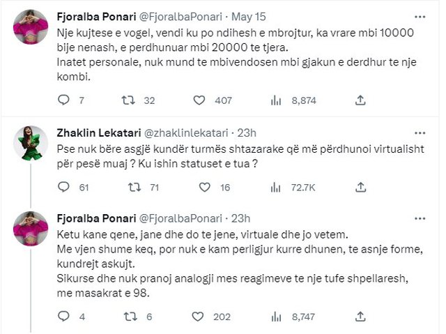 “Pse nuk bërë asgjë kundër turmës shtazarake që më përdhunoi virtualisht për pesë muaj? Ku ishin statuset e tua?”- i shkroi opinionistja, ndërsa Fjoralba iu kundërpërgjigj: