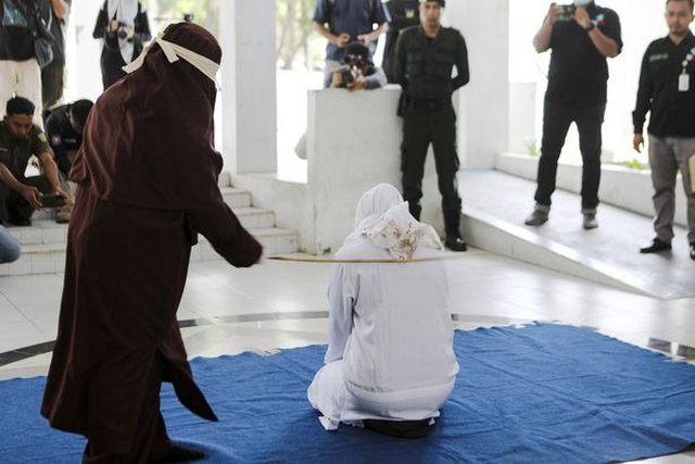 Gruaja, RO, 23 vjeç dhe burri, M, 24 vjeç, morën secili nga 21 gjuajtje me kamxhik. Fotot tregojnë një oficer policie duke folur në mikrofon me shikuesit, të cilët vëzhguan çiftin duke u ndëshkuar dhe i fotografuan.