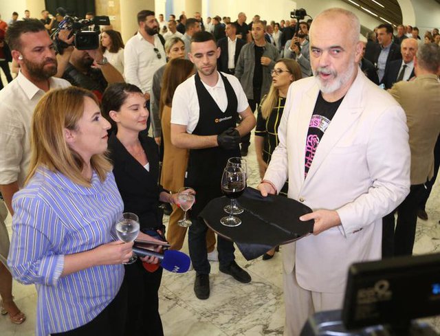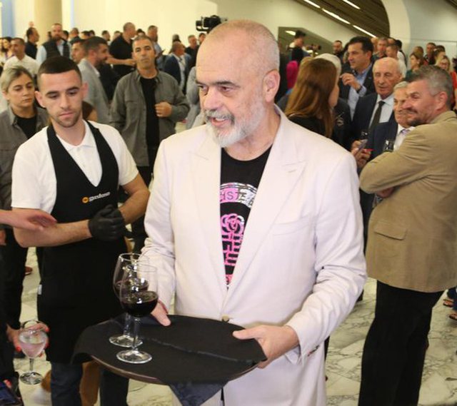 Kryeministri Edi Rama gjatë 32-vjetorit të PS-së ka bërë dhe rolin e kamarierit. Kjo pasi i ka marrë tabakanë djalit që po shërbente dhe ka shkuar vetë që tu shërbente të ftuarve nga një gotë verë.