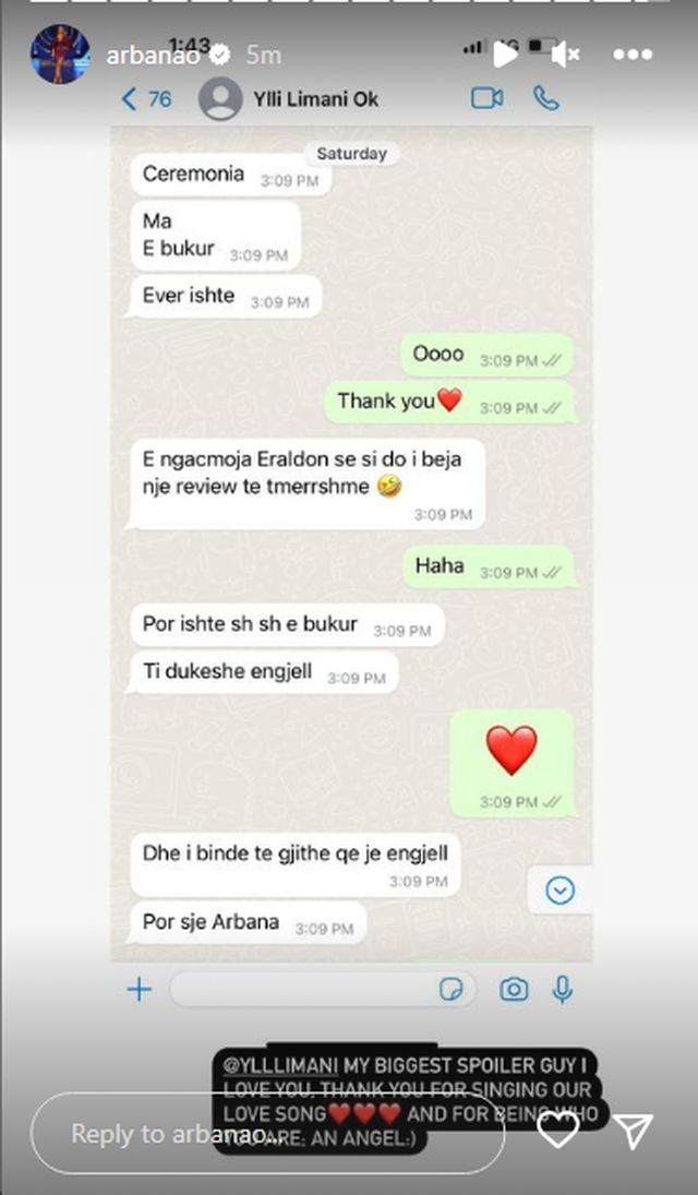 Moderatorja I ka shprehur mirënjohjen dhe dashurinë. “Të dua, faleminderit që këndove këngën tonë të dashurisë dhe faleminderit që je ky që je: një ëngjëll”, ka shkruar Arbana krahas bisedës.