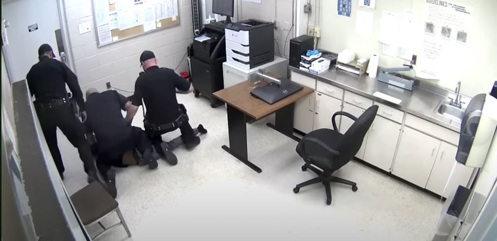 Polici fillimisht e gjuan me grusht në fytyrë të burgosurin dhe e hedh në dysheme. Më pas një tjetër oficer e mban të arrestuarin të mos lëvizë dhe ia godasin kokën në dysheme.