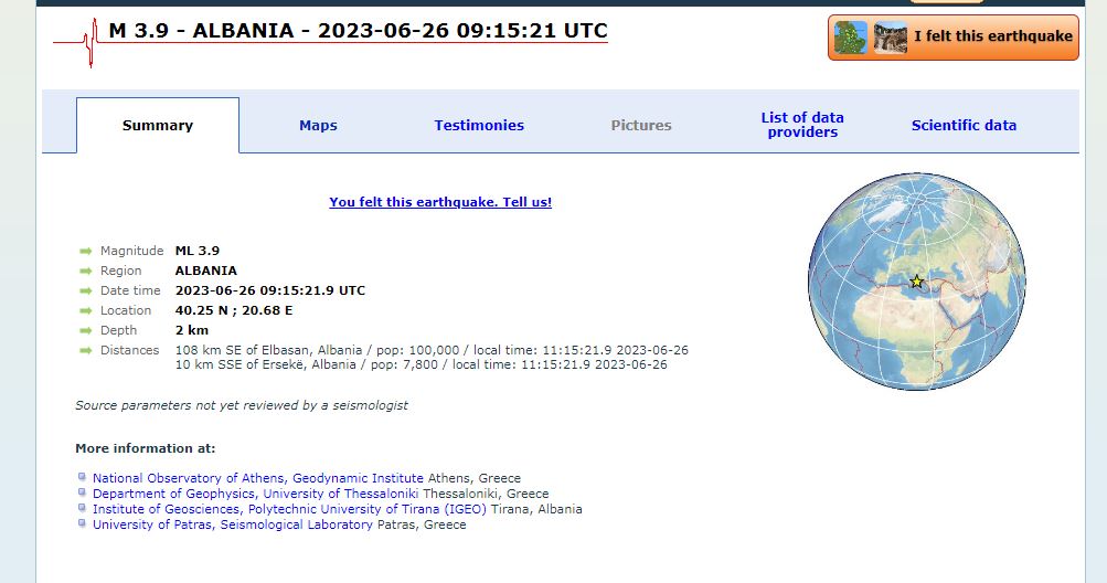 Ersekë- Një tërmet 3.9 ballë godet Shqipërinë.