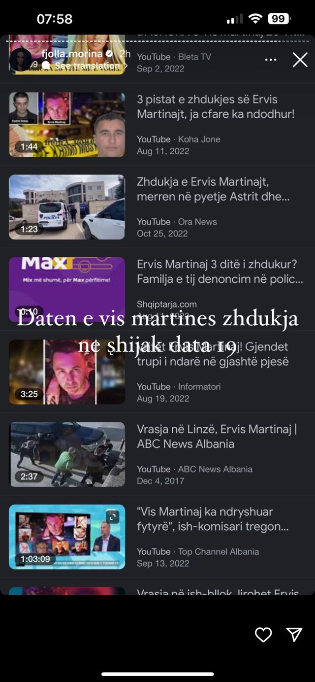 Ajo ka postuar një ‘instastory’ ku tregon datën e zhdukjes së Ervis Martinajt, 19 shtator 2022.