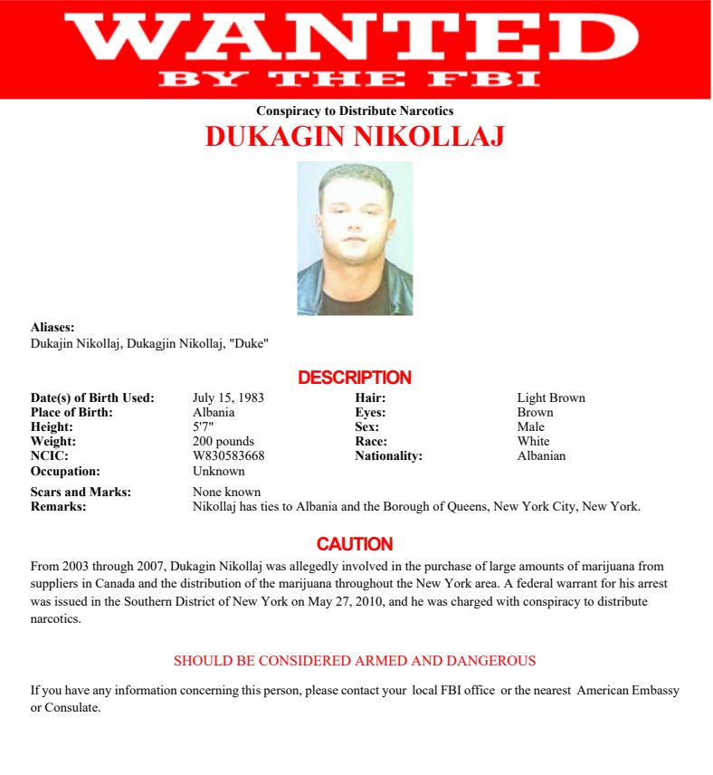 I njohur me pseudenimin “Duka”, Dukagjin Nikollaj kërkohet edhe nga FBI-ja për trafikim narkotikësh.
