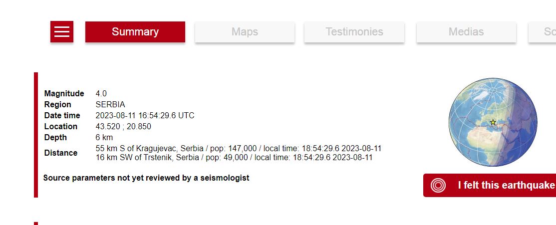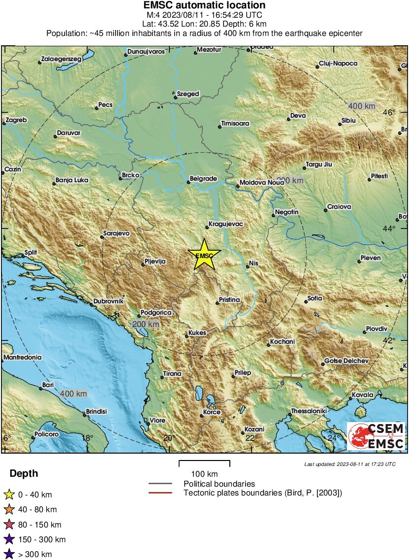 Sipas Qendrës Sizmologjike Evropiane-Mesdhetare, tërmeti ishte i thellë 6 km, ndërsa zona e prekur ishte Kragujevaci dhe Trstenik të Serbisë.