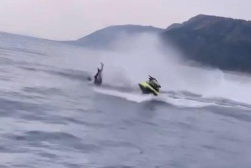 Në videon e publikuar, shihet Luizi teksa drejton motorrin e ujit me shpejtësi, dhe si pasojë bie, duke përfunduar në det.