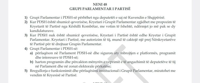 3) Kur PDSH nuk është shumicë qeverisëse, Kryetari i Partisë është edhe Kryetar i Grupit Parlamentar. Kryetari i Partisë, me autorizim të tij, mund të caktojë një prej Nënkryetarëve të Partisë për të drejtuar Grupin Parlamentar.