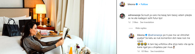 “Po ti pse ma var shtrohet pyetja? Se këtu as nuk komenton dot nëse nuk më ndjek. Ik tani bëj unfollow dhe shijo këto vite që të kanë ngelë pa u shqetësuar për mua”, i shkruan Bleona.