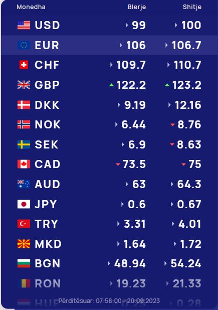 Euro do blihet me 106 lekë dhe do shitet me 106.7 lekë, ndërsa franga zvicerane do blihet me 109.7 lekë dhe do shitet me 110.7 lekë.