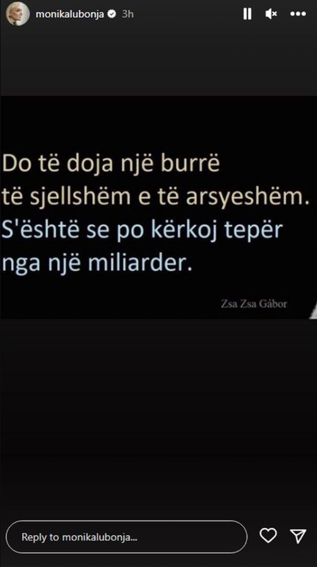Aktorja e njohur Monika Lubonja është shumë aktive në rrjetet sociale dhe së fundmi ka postuar një shprehje në InstaStory ku ka treguar se është në kërkim të mashkullit ideal.