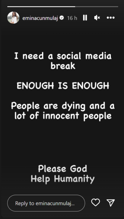 “Kam nevojë për një shkëputje nga rrjetet sociale. Mjaft më. Njerëzit po vdesin dhe shumë njerëz të pafajshëm. Të lutem Zot, ndihmoje njerëzimin”, shkruan Emina në postimin e saj në Instastory.