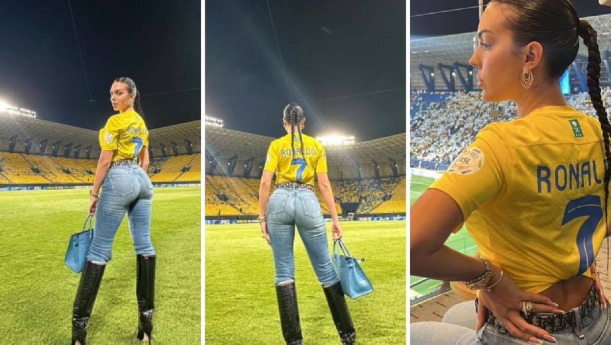 Në fakt, Georgina u shfaq në stadiumin e Riadit e veshur me fanellën e Al Nassr, me numrin 7 të Ronaldos, por edhe me një palë xhinse shumë të ngushta, që i lanë shumë pak vend imagjinatës. Me këtë rast kishte veshur çizme të zeza me lëkurë krokodili.