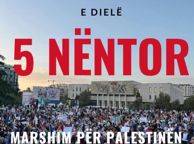 TIRANË-Ditën e nesërme në 5 Nëntor është planifikuar dhe njoftuar në Tiranë një protestë pro-Palestinës. Tubimi është ndërrmarë nga 6 shoqata të cilat janë “Mexhlis”, “Ardhmëria”, “Thirrja në Mirësi”, “Tumed” dhe “Qendra për Kulturën Islame Evropiane” dhe “Ensar”. Tubimi do të nisë në orën 12:00, në sheshin Skënderbej dhe më pas do të marshohet deri në sheshin Nënë Tereza.