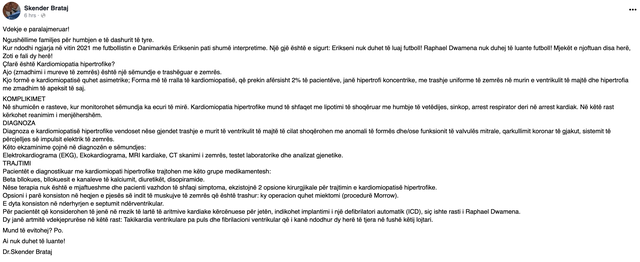 "Kur ndodhi ngjarja në vitin 2021 me futbollistin e Danimarkës Eriksenin pati shumë interpretime. Një gjë është e sigurt: Erikseni nuk duhet të luaj futboll! Raphael Dëamena nuk duhej të luante futboll! Mjekët e njoftuan disa herë, Zoti e fali dy herë!