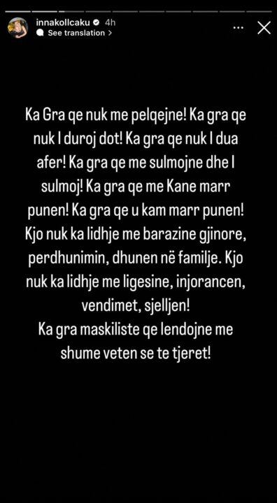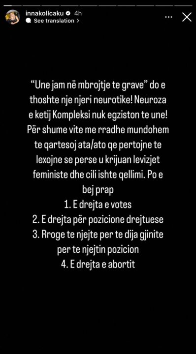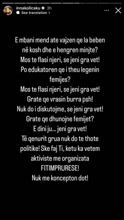 “Ka Gra që nuk më pëlqejnë! Ka gra që nuk i duroj dot! Ka gra që nuk i dua afer! Ka gra që më sulmojnë dhe i sulmoj! Ka gra që më kanë marr punën! Ka gra që ua kam marr punën! Kjo nuk ka lidhje me barazinë gjinore, përdhunimin, dhunën në familje. Kjo nuk ka lidhje me ligësinë, injorancën, vëndimet, sjelljen! Ka gra maskiliste që lëndojnë më shumë veten se të tjerët!”