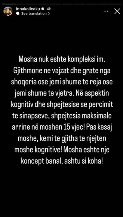“Mosha nuk është kompleksi im. Gjithmonë ne vajzat dhe gratë nga shoqëria ose jemi shumë të reja ose jemi shumë të vjetra. Në aspektin kognitiv dhe shpejtësisë së percimit të sinapseve, shpejtësia maksimale arrin në moshën 15 vjec! Pas kësaj moshe, kemi të gjitha të njëjtën moshë kognitive! Mosha është një koncept banal, ashtu si koha!