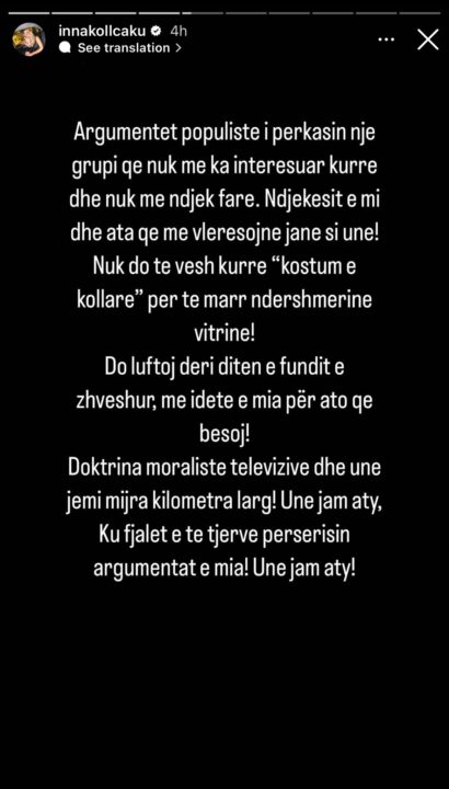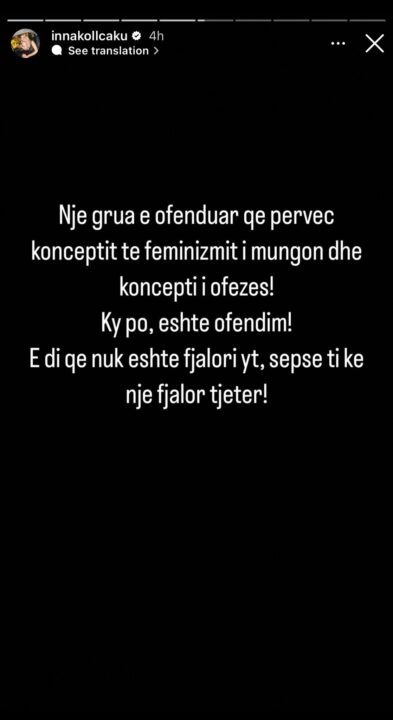 Lidhur me këtë deklaratë të Valbonës, nuk ka vonuar edhe përgjigjia e Inës, e cila përmes disa postimeve të bëra në profilin e saj të Instagramit, ka treguar se në fakt Valbonës i mungon koncepti i feminizmit dhe i ofezës.