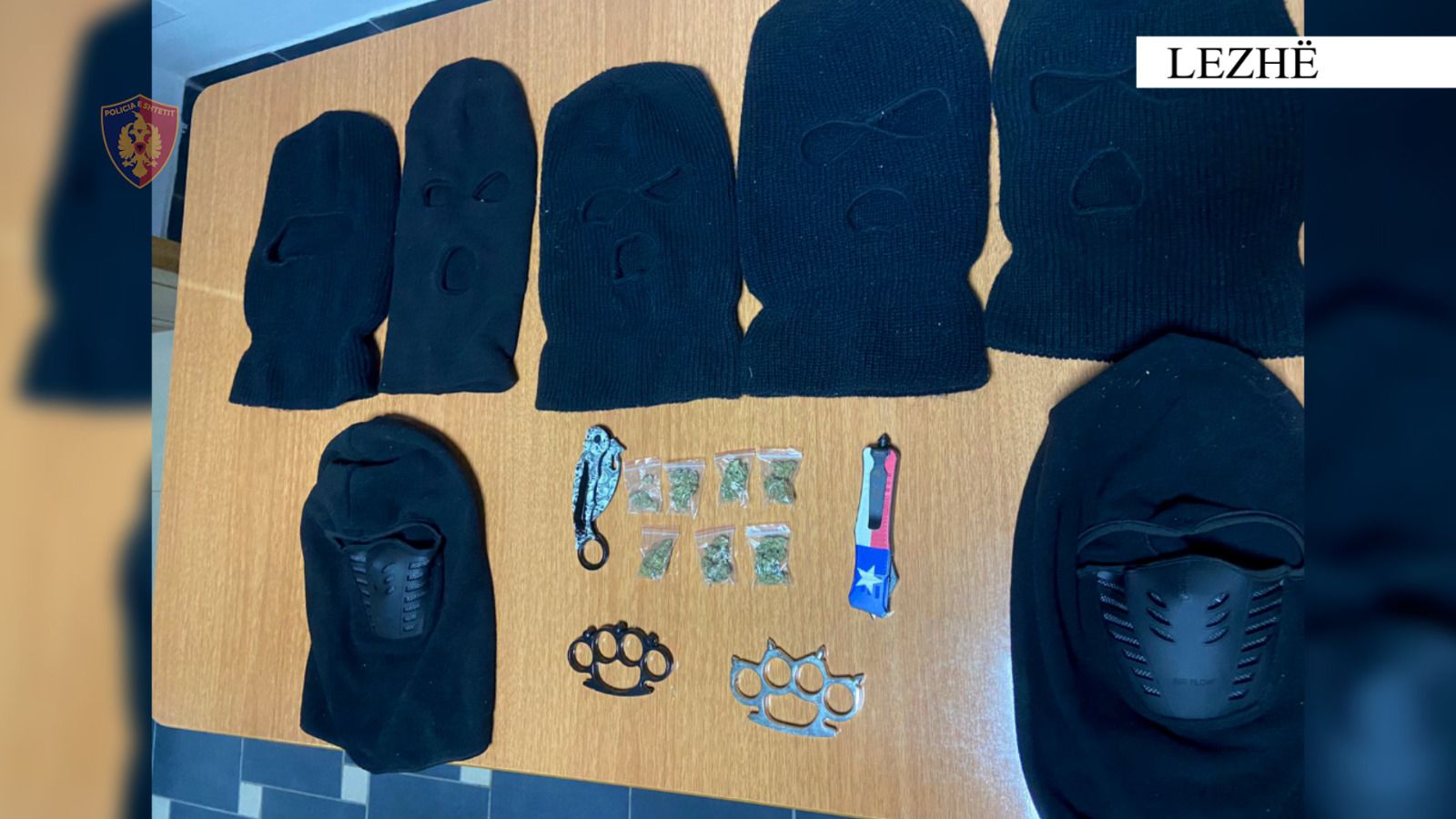 Nga kontrolli fizik i kryer ndaj shtetasit E. K., në lagjen “Gurra”, Lezhë, shërbimet e Policisë gjetën një sasi lënde narkotike cannabis sativa, të ndarë në doza, të gatshme për shitje. Më tej, në banesën e këtij shtetasi, në të njëjtën lagje, gjetën 7 maska, të cilat dyshohet se posedoheshin për qëllime kriminale, 2 mjete prerëse (thika) dhe 2 përforcues grushti.
