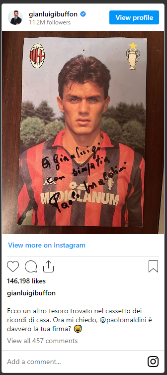 "Këtu është një thesar tjetër i gjetur në sirtarin e kujtimeve në shtëpi. Tani pyes veten: a është vërtet nënshkrimi juaj, Paolo Maldini?" Paolo Maldini nuk humbi kohë dhe sërish në Instagram i është përgjigjur Gianluigi Buffon duke e “zhgënjyer”: