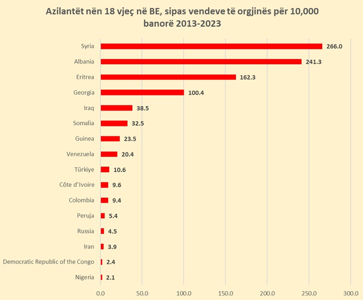 Të dhënat e Eurostat tregojnë se përgjatë 10-vjeçarit të fundit 64,215 mijë të rinj nën 18 vjeç nga Shqipëria kërkuan azil në një nga vendet e BE-së, duke e renditur vendin tonë të katërtin në botë pas Sirisë (590 mijë), Afganistanit (358 mijë), Irakut (170 mijë) dhe Turqisë (64.2 mijë), të cilat kanë qenë në luftë (përveç Turqisë) dhe kanë popullsi shumë më të madhe se Shqipëria.