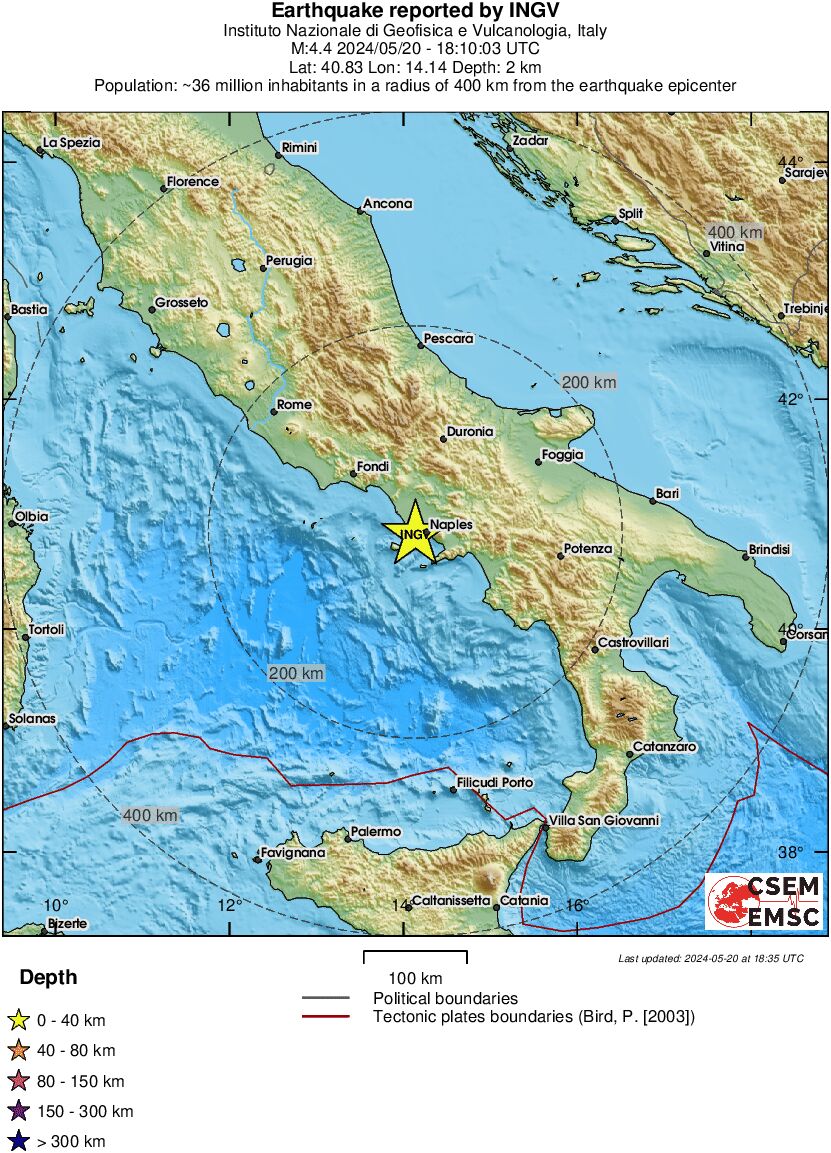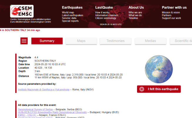 Mësohet se tërmeti ka qënë me magnitudë 4.4 ballë dhe epiqendra ka qënë në qytetin e Napolit, në Campi Flegrei në një thellësi prej 10 kilometrash.