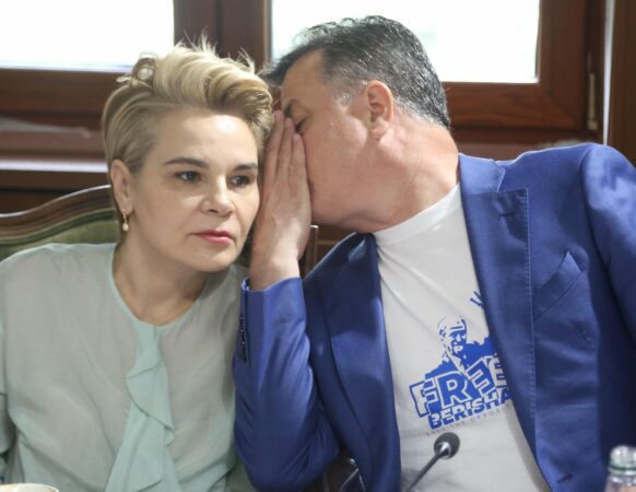 Teksa Altin Dumani po bën raportin vjetor të punës së SPAK, deputetët opozitarë Monika Kryemadhi dhe Flamur Noka shihen teksa pëshpëritin vesh më vesh, e duke qeshur me njeri-tjetrin.