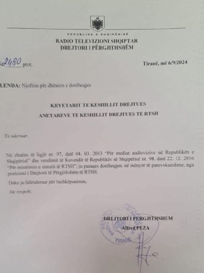 TIRANA- Drejtor i Radio Televizionit Publik Shqiptar, Alfred Peza, ka dhë dorëheqjen nga posti.