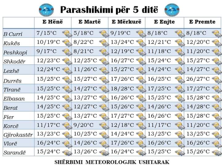 Temperaturat gjatë gjithë javës pritet të jenë çdo ditë të luhatshme duke variuar nga 5 gradë Celsius në zonat malore deri në 28 gradë në Shqipëri e Mesme.