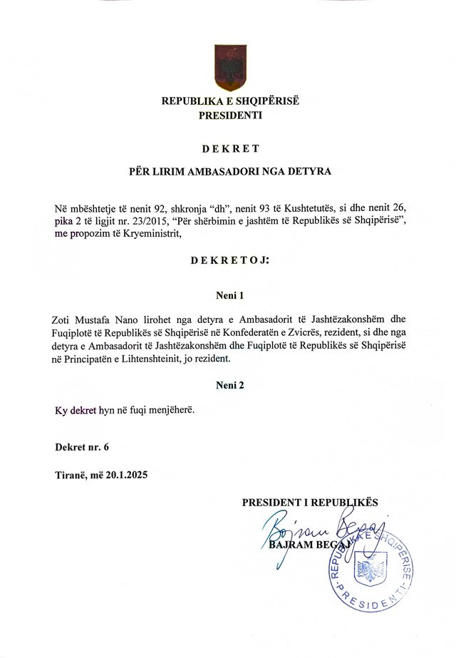 Presidenti Begaj dekreton lirimin e zotit Mustafa Nano nga detyra e Ambasadorit të Jashtëzakonshëm dhe Fuqiplotë të Republikës së Shqipërisë në Konfederatën e Zvicrës, rezident, si dhe nga detyra e Ambasadorit të Jashtëzakonshëm dhe Fuqiplotë të Republikës së Shqipërisë në Principatën e Lihtenshteinit, jo rezident.