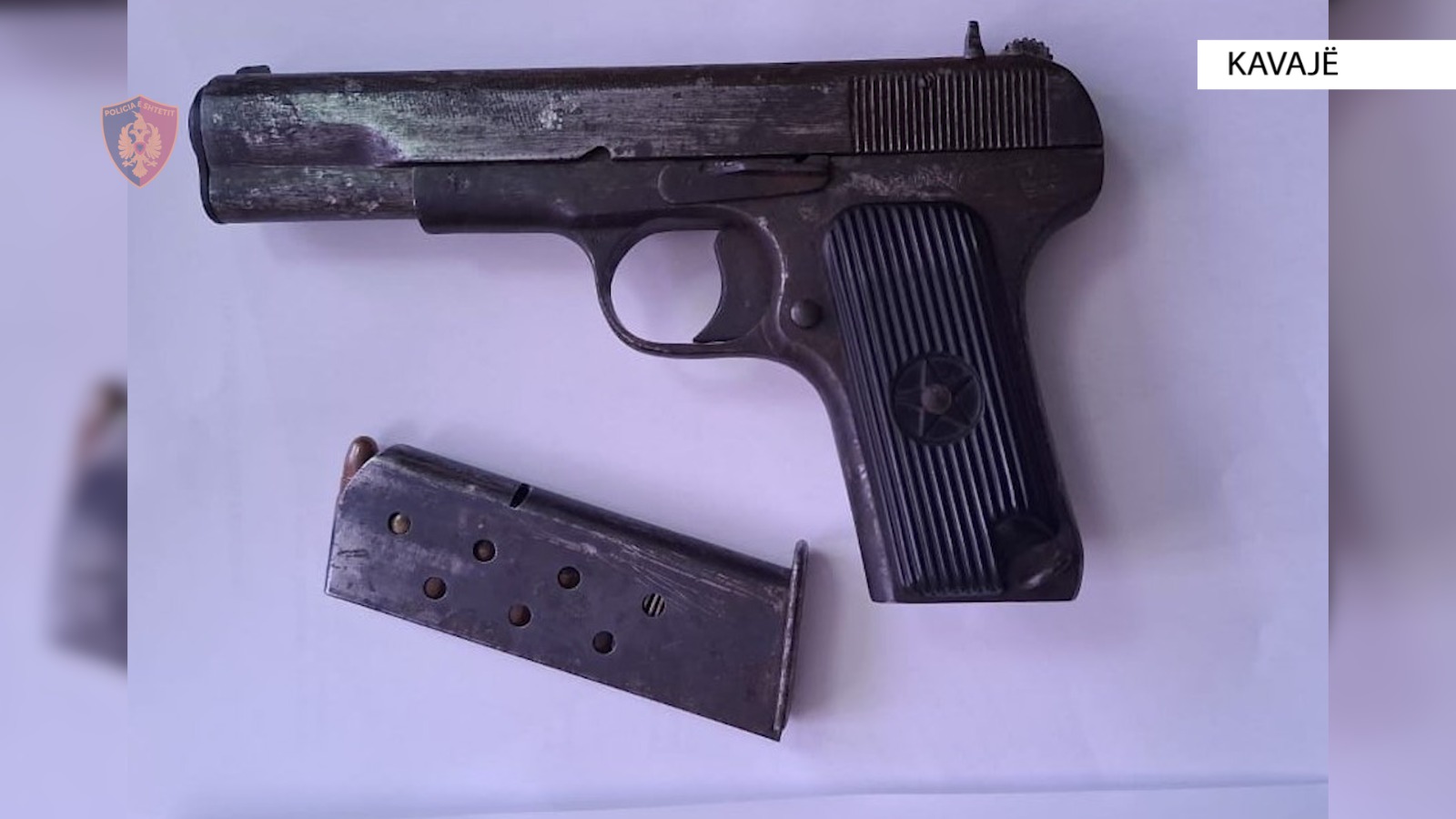 ‘Shërbimet e Komisariatit të Policisë Kavajë, pas një informacionit të marrë falë bashkëpunimit me qytetarët, bënë të mundur lokalizimin, kapjen dhe shoqërimin e 12 vjeçarit me banim në fshatin Luz i Vogël, Kavajë, i cili mbante me vete një armë zjarri pistoletë me një krehër me fishekë luftarak.