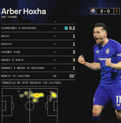 Arbër Hoxha u shndërrua në yllin e ndeshjes për Dinamon e Zagreb e cila mposhti me rezultatin 3-0 Shibenik.