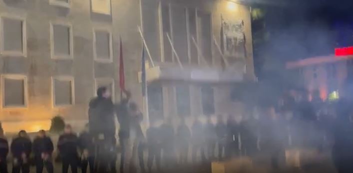 Në momentin që Berisha është ngjitur në podium, protestuesit kanë hedhur kapsolle dhe tymuese drejt Kryeministrisë.