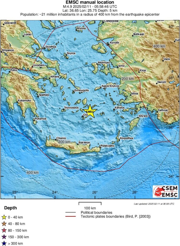 SANTORINI- Santorini është goditur nga një tjetër tërmet i madh ndërsa të tjerë më të vegjël janë të vazhdueshëm në ishullin grek. Tërmeti ishte me magnitudë 5.3 ballë, ndërsa është më i fuqishmi që ka goditur ishullin deri tani. Lëkundjet u regjistruan në orën 22:16 me orën lokale të së hënës dhe kishte një epiqendër 14 km në jugperëndim të Arkesinit, në detin midis Santorinit dhe Amorgos. Vasilis Karastathis, drejtor i Institutit Gjeodinamik tha për Kathimerini se ky tërmet me magnitudë 5.3 ballë të shkallës Rihter, nuk ndryshon thelbësisht nga tërmetet e mëparshme dhe është pjesë e serisë.