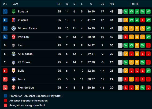 Pas mbylljes së javës së 25-të renditja kryesohet nga Egnatia me 48 pikë, ndjekur nga Vllaznia me 44 pikë, Dinamo me 41 dhe Partizani me 40 pikë. Në fund Bylis, Teuta dhe Skënderbeu.