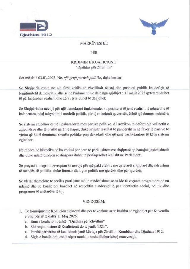 Lëvizja për Zhvillim Kombëtar e Dashamir Shehit dhe Partia “Djathtas 1912” e drejtuar nga Enkelejd Alibeaj kanë zyrtarizuar koalicionin që do të quhet “Djathtas për Zhvillim”.