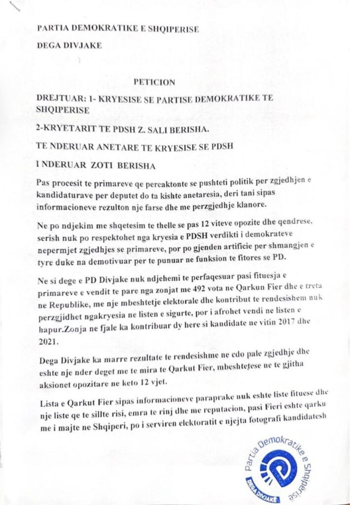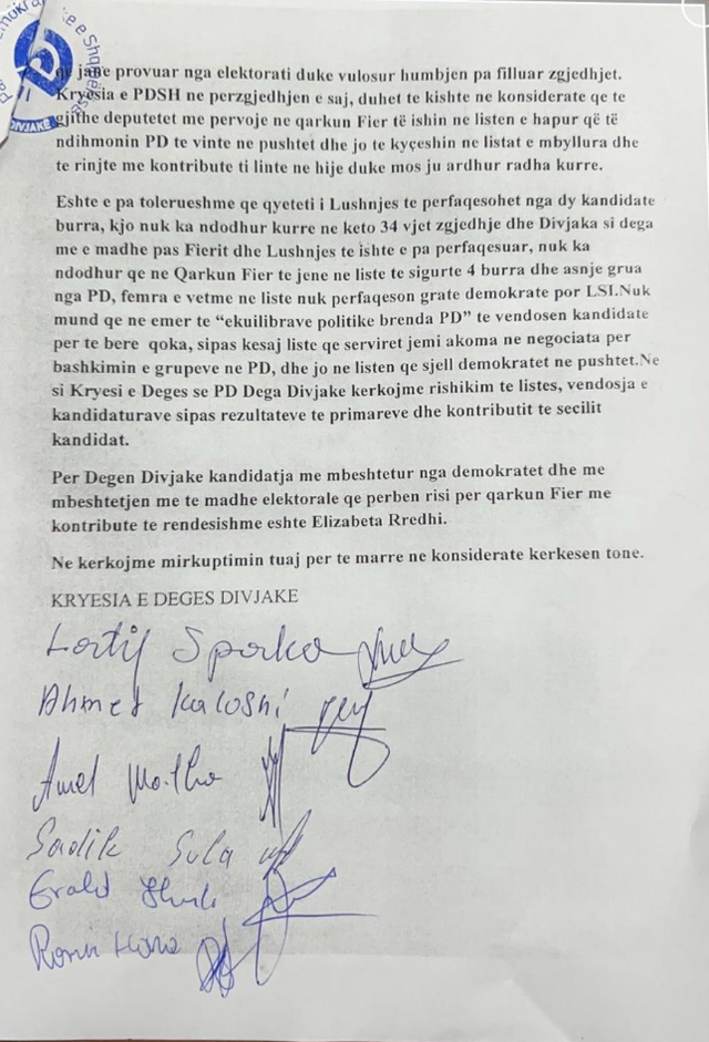 Një grup firmëtarësh të Partisë Demokratike në Fier dhe konkretisht të zonës së Divjakës i kanë dërguar Kryesisë dhe kreut të PD Sali Berisha, pakënaqësitë për listën e mbyllur të këtij qarku, ku nuk është përfshirë emri i kandidates Elisabeta Rredhi, që u vlerësua në Primaret e këtij qarku me votën e 492 anëtarëve.
