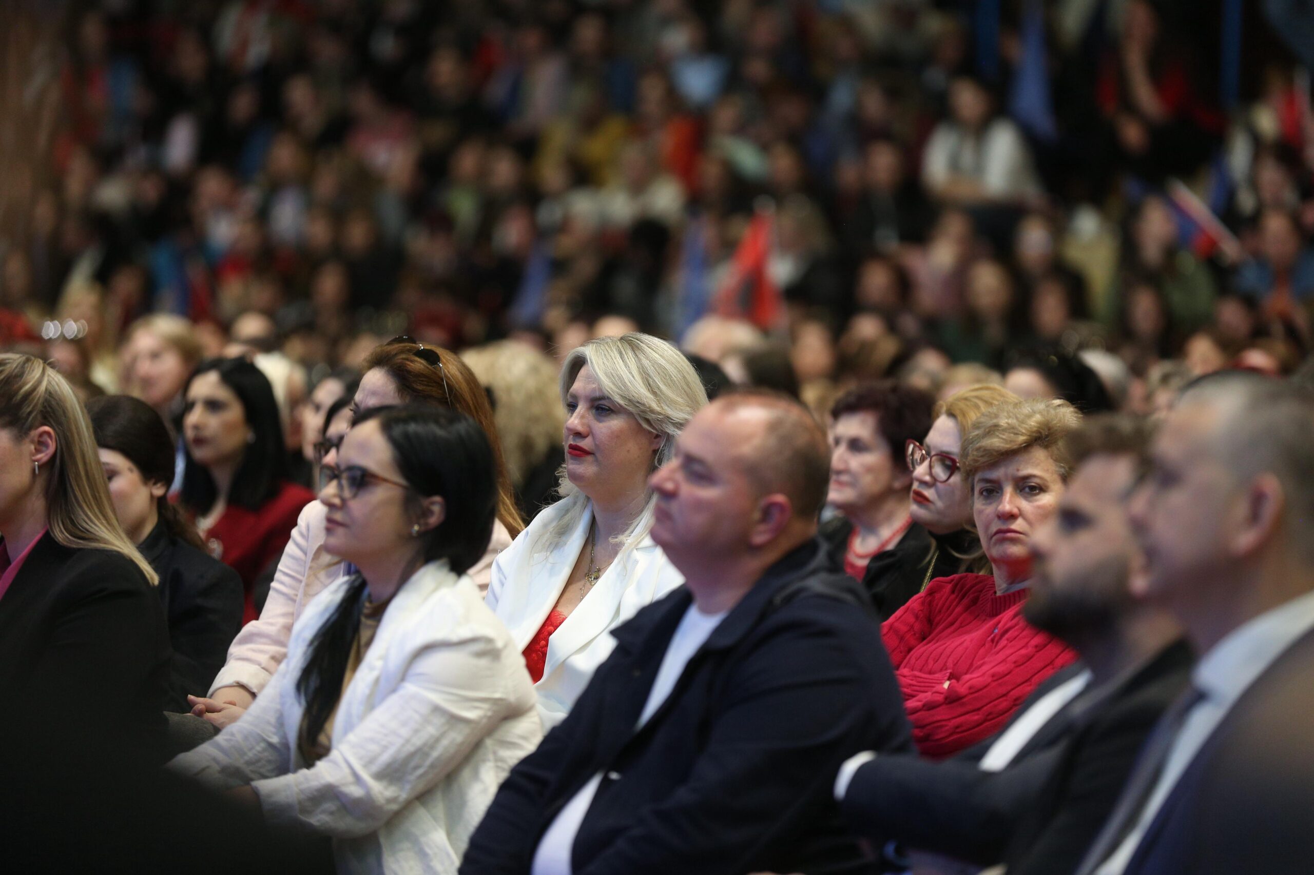Është jo vetëm kënaqësi, por është dhe një nder i veçantë kjo mikpritje e jashtëzakonshme këtu e grave dhe vajzave të Korçës dhe doja të ndaja me ju një shqetësim, sepse sot posaçërisht kam pasur disa ankesa dhe mesazhe nga disa burra, shokë partie që janë shqetësuar pse unë lavdëroj gratë dhe sipas tyre iu bie burrave.