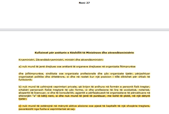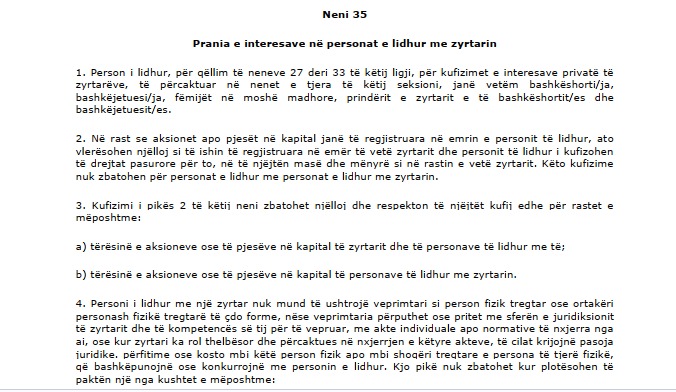 Në zbatim të ligjit për konfliktin e interesit, nenet 27 dhe 35, në rast se aksionet apo pjesët në kapital janë të regjistruara në emrin e personit të lidhur, ato vlerësohen njëlloj si të ishin të regjistruara në emër të vetë zyrtarit, dhe personit të lidhur i kufizohen të drejtat pasurore për to, në të njëjtën masë dhe mënyrë si në rastin e vetë zyrtarit.