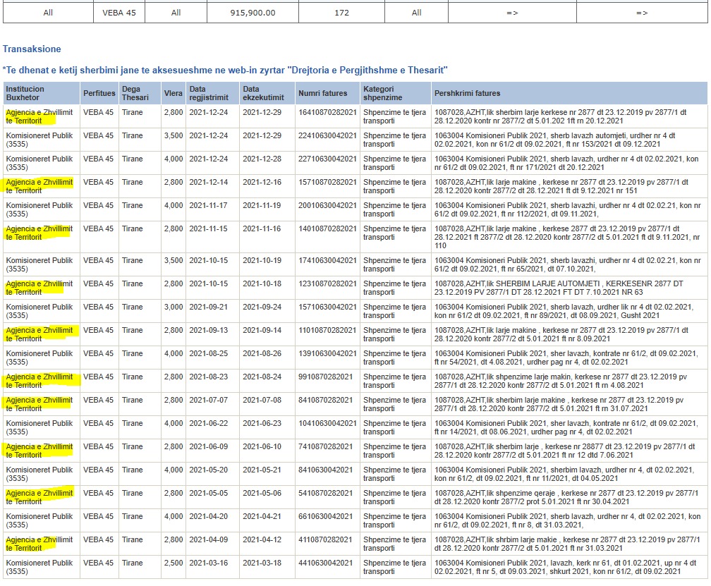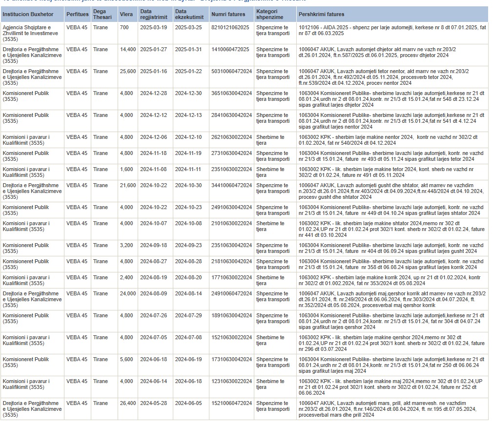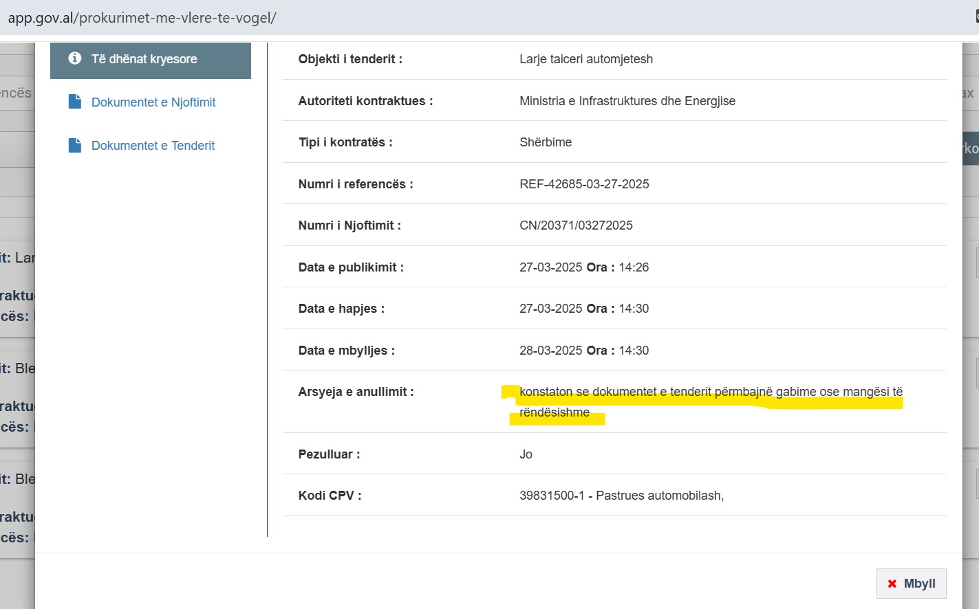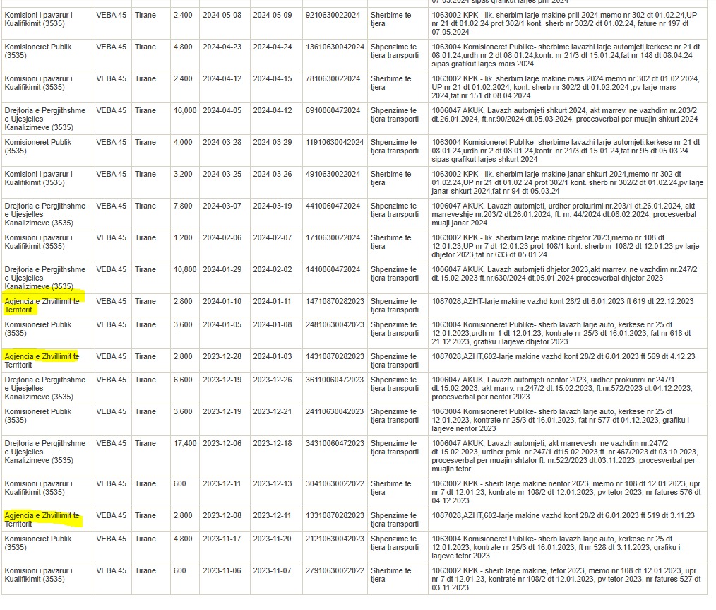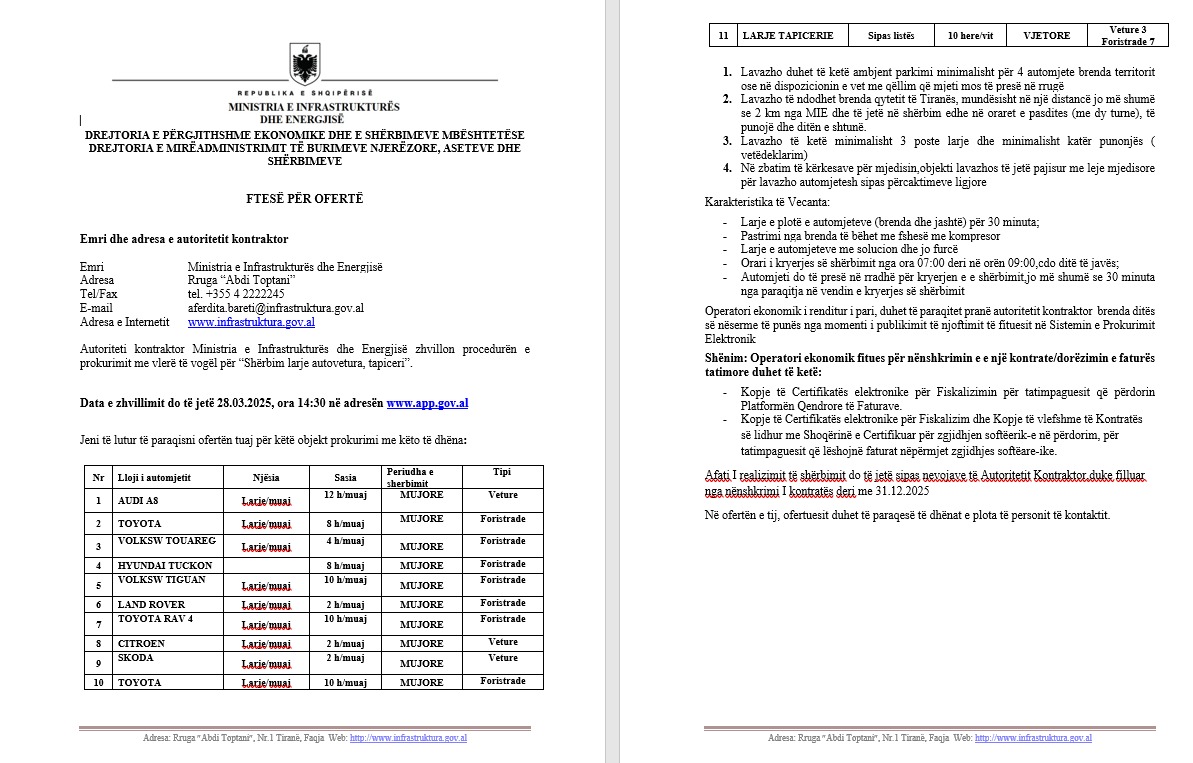 Prandaj edhe specifikimet teknike të vendosura në ftesën për ofertë të procedurës me objekt ‘Shërbim larje autovetura, tapiceri’ që do të zhvillohej në 28 Mars, i përshtateshin fiks lavazhit e parkimit të Veba 45 shpk.