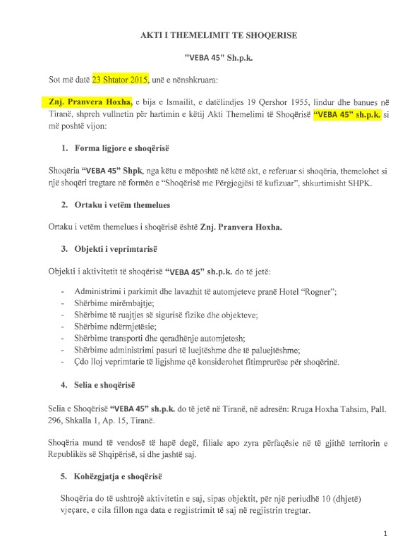 "Nëna 70 vjeçare e ministrit Hoxha, rezulton pronare e subjektit tregtar ‘Veba 45’ shpk me objekt ‘administrimi i parkimit dhe lavazhit të automjeteve pranë Hotel ‘Rogner’.