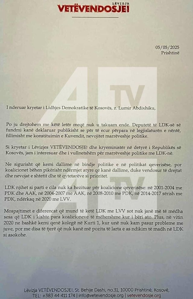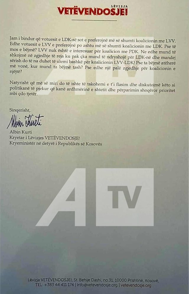 Në këtë letër, Kurti i propozon Abdixhikut një marrëveshje bashkëqeverisëse dhe e fton zyrtarisht LDK-në në koalicion.