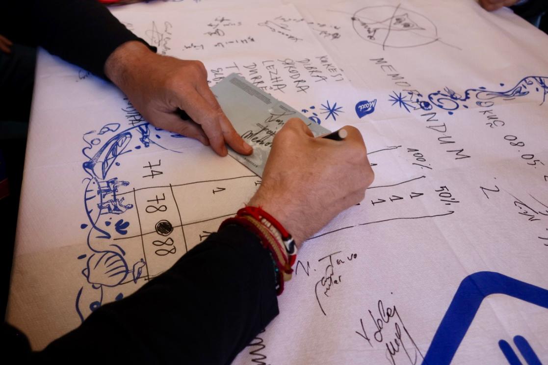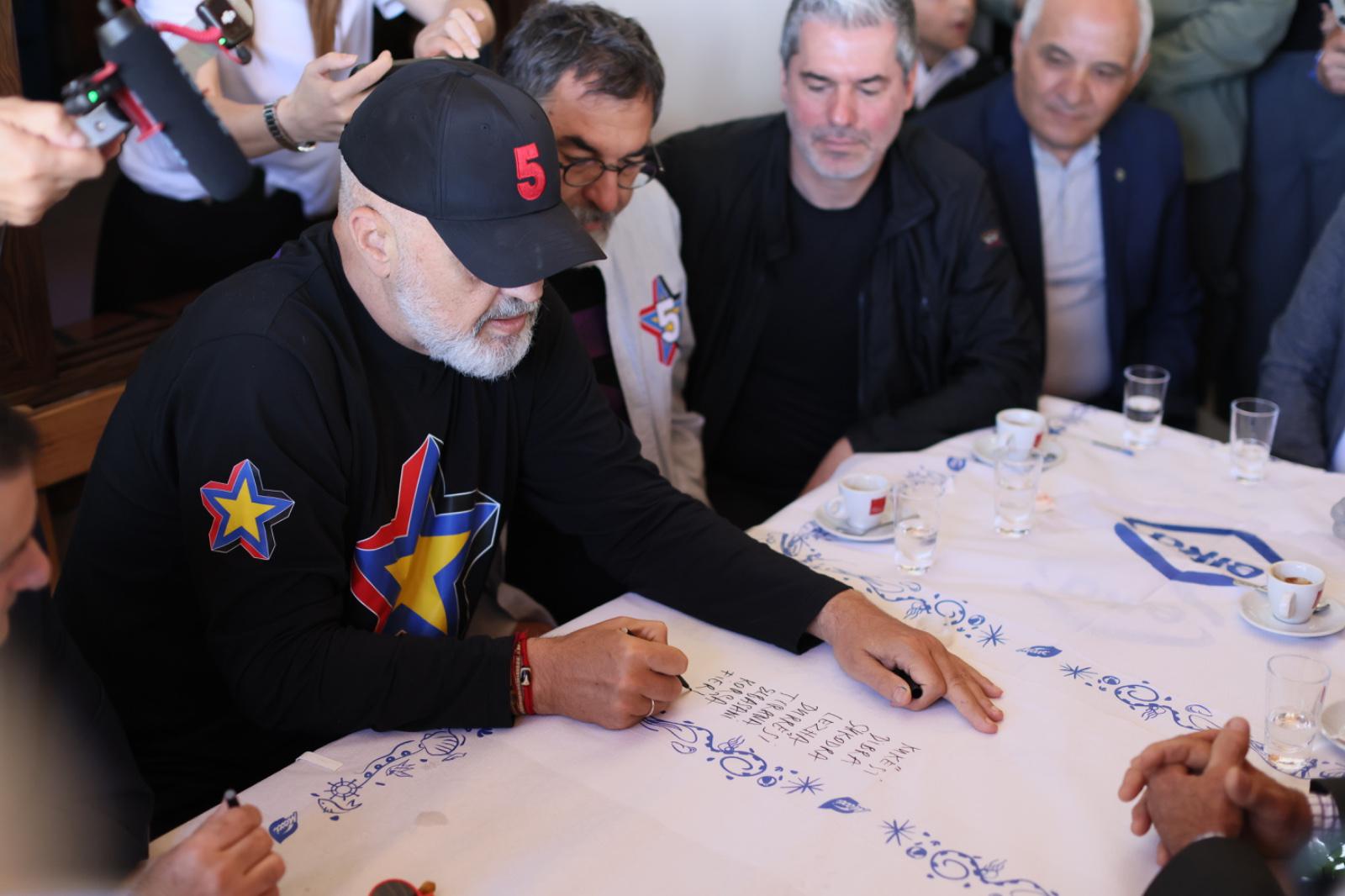 Atëherë 78 dhe 88. Në këtë shifër do lëvizë, midis kësaj dhe kësaj. Nuk do jetë as kjo, do jetë diçka këtu midis se diku do marrim, diku do lëmë. Midis 78 dhe 88 lëviz Partia Socialiste këtë herë. Kështu që unë po e firmos këtu memorandumin këtu. Urdhëro. Vazhdoni hidhni firmat ju.” – u shpreh Kryetari i PSSH Edi Rama, i cili i ftoi të pranishmit të vendosnin firmat e tyre. Më pas, një prej banorëve, njëkohësisht pronari i lokalit ku u zhvillua takimi i dhuroi Kryetarit të PSSH Rama një pasaportë simbolike të BE. /noa.al