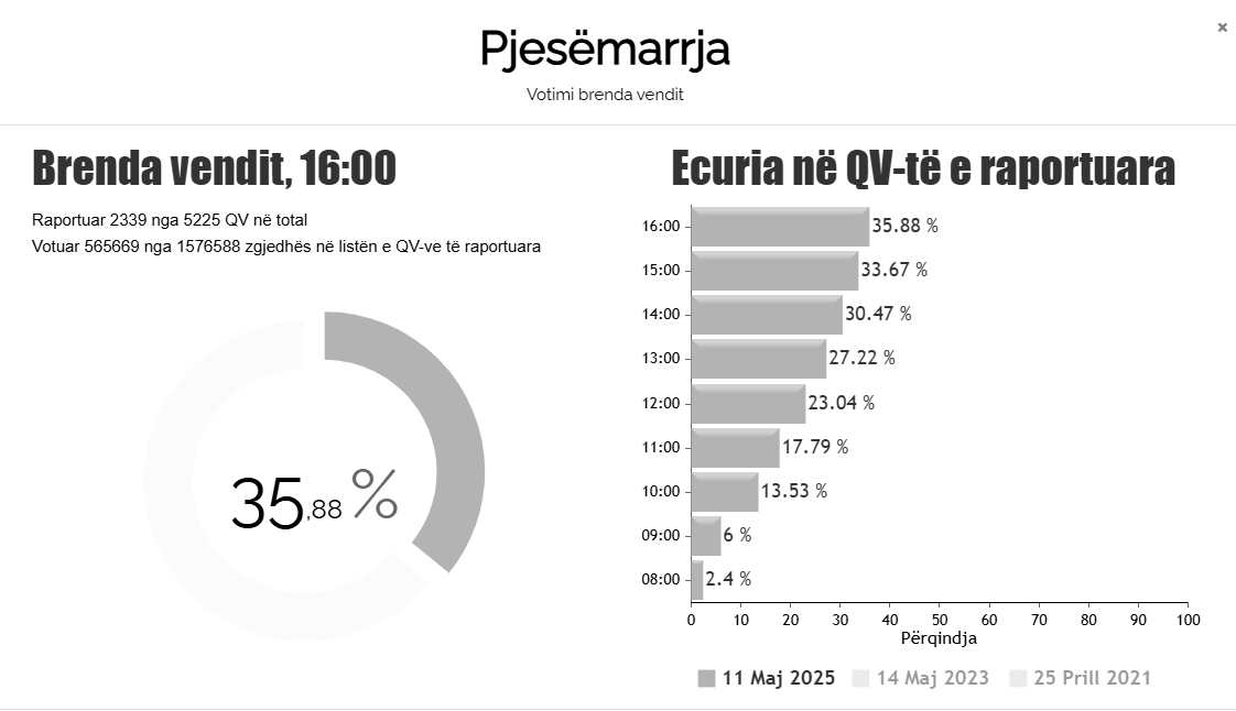 TIRANË- Komisioni Qëndror i Zgjedhjeve ka publikuar të dhënat e pjesëmarrjes në votime nga qytetarët ditën e sotme. Sipas përditësimit të KQZ-së, deri në orën 16:00, pjesëmarrja në rang vendi ka arritur në 35.88%.