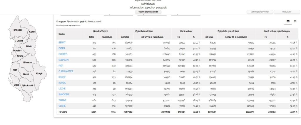 Tiranë, 11 maj 2025 – Komisioni Qendror i Zgjedhjeve ka publikuar të dhënat zyrtare për pjesëmarrjen në votime në të gjithë territorin e Shqipërisë dhe në Diasporë. Sipas KQZ, 42.16% e qytetarëve me të drejtë vote morën pjesë në zgjedhjet e 11 majit.