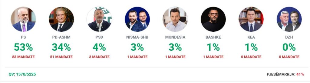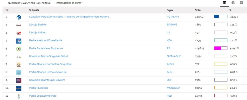 Janë numëruar 1527 kuti nga 5225 në total. PS kryeson me 52.85 % (203046 vota). Ndiqet nga PD me 34.27 % (131662 vota).
