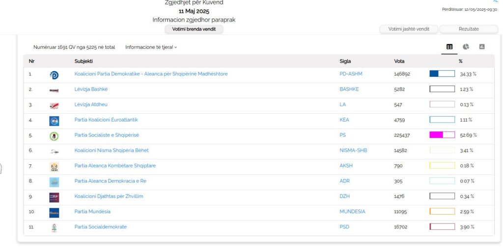 Tiranë- Teksa janë numëruar mbi 28% e votave në rang vendi, rezultatet paraprake tregojnë një avantazh të thellë për Partinë Socialiste, e cila kryeson me 53% të votave dhe parashikohet të sigurojë 83 mandate në Kuvend.