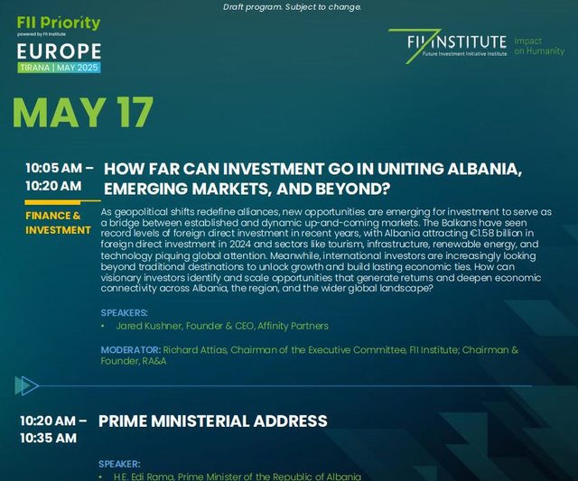 Programi të cilin JavaNews e ka siguruar si dokument përcakton se Kushnër do të flasë këtë të Shtunë në kryeqytetin e Shqipërisë nën cilësinë e CEO-s dhe themeluesit të “Affinity Partners”. Fjalimi i cili në axhendë është parashikuar të mbahet mes orës 10:05 dhe 10:25 të 17 majit do të pasohet më pas nga fjala e kryeministrit Edi Rama.