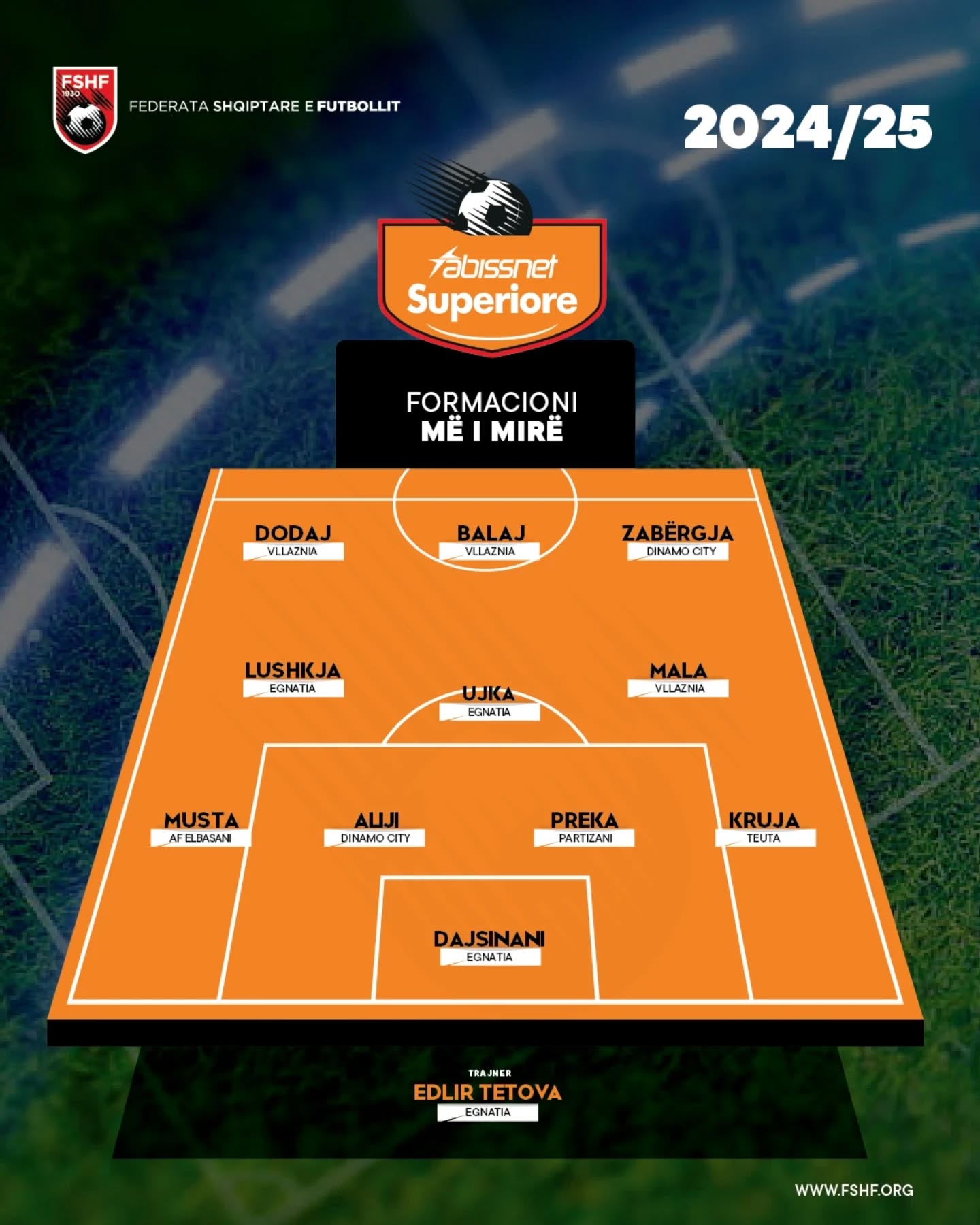 Federata Shqiptare e Futbollit ka publikuar formacionin më të mirë të sezonit 2024-2025 në Kategorinë Superiore. Përzgjedhje e realizuar nga trajnerët e ekipeve kombëtare të moshave, të cilët kanë vlerësuar më të mirët në çdo pozicion, bazuar në paraqitjet e tyre gjatë gjithë sezonit.